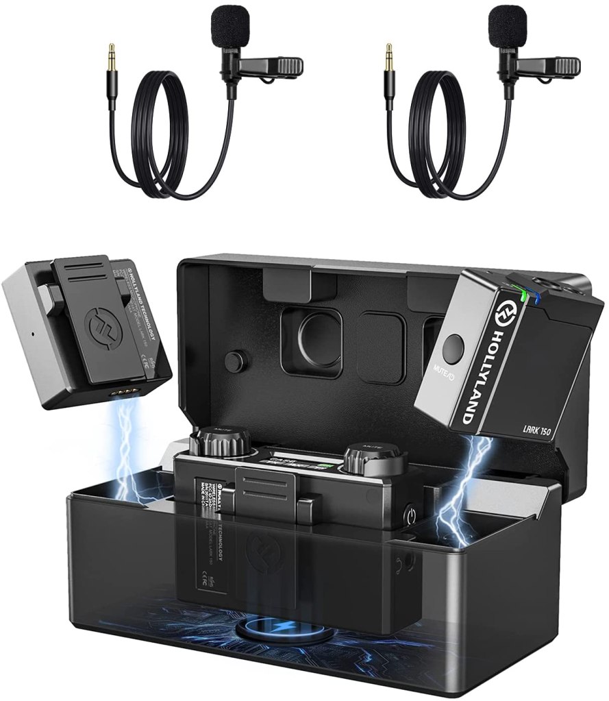 Dos Micrófonos inalámbricos Lavalier $1000 pesos de renta por día 2.4G Hollyland Lark 150 micrófono de solapa con funda de carga, 2 & 20 g, transmisores ultraligeros integrados Hi-Fi MEMS Mic 5ms latencia y 100m DSP